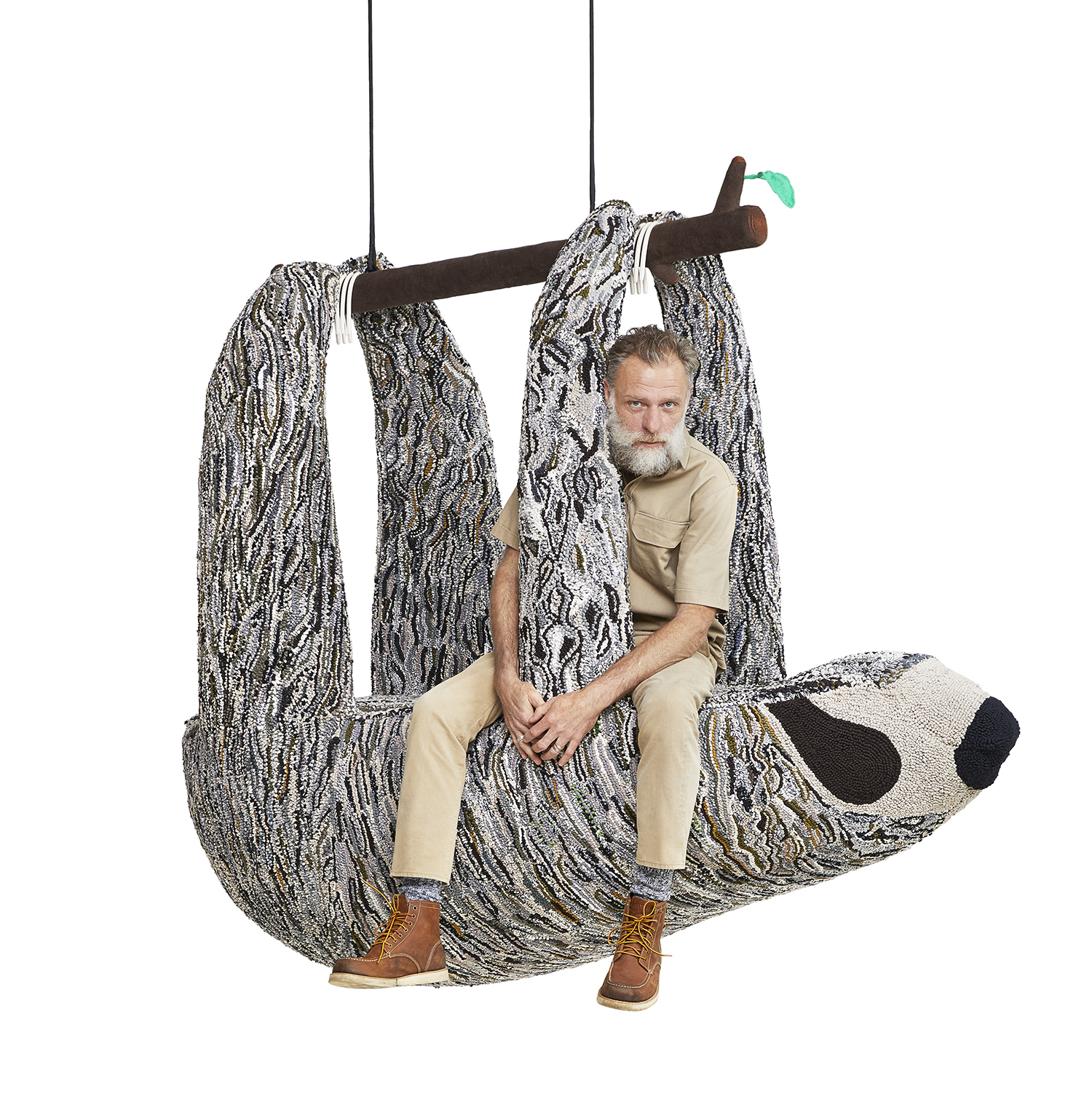 Best known for his woven human nest pods and larger-than-life leather hanging sculptures – Porky’s whimsical pieces are beloved and acclaimed for the innate sense of wonder that prevails upon all who find themselves sitting in the mouth of a killer whale or lying horizontally in the body of a crocodile. But then Porky has long had a thing for animals that coupled with a fascination for the natural world and a sense of the ridiculousness that is manifest in every one of his designs. ‘The preservation and survival of our natural environments and animals is critical for future generations as is the preservation of human skills, crafts, and traditions,’ says Hefer. As such each piece in the Endangered series has been hand worked by artisans in Cape Town where Porky’s studio is based using environmentally sustainable materials to crochet, felt, stitch and embroider the surfaces.